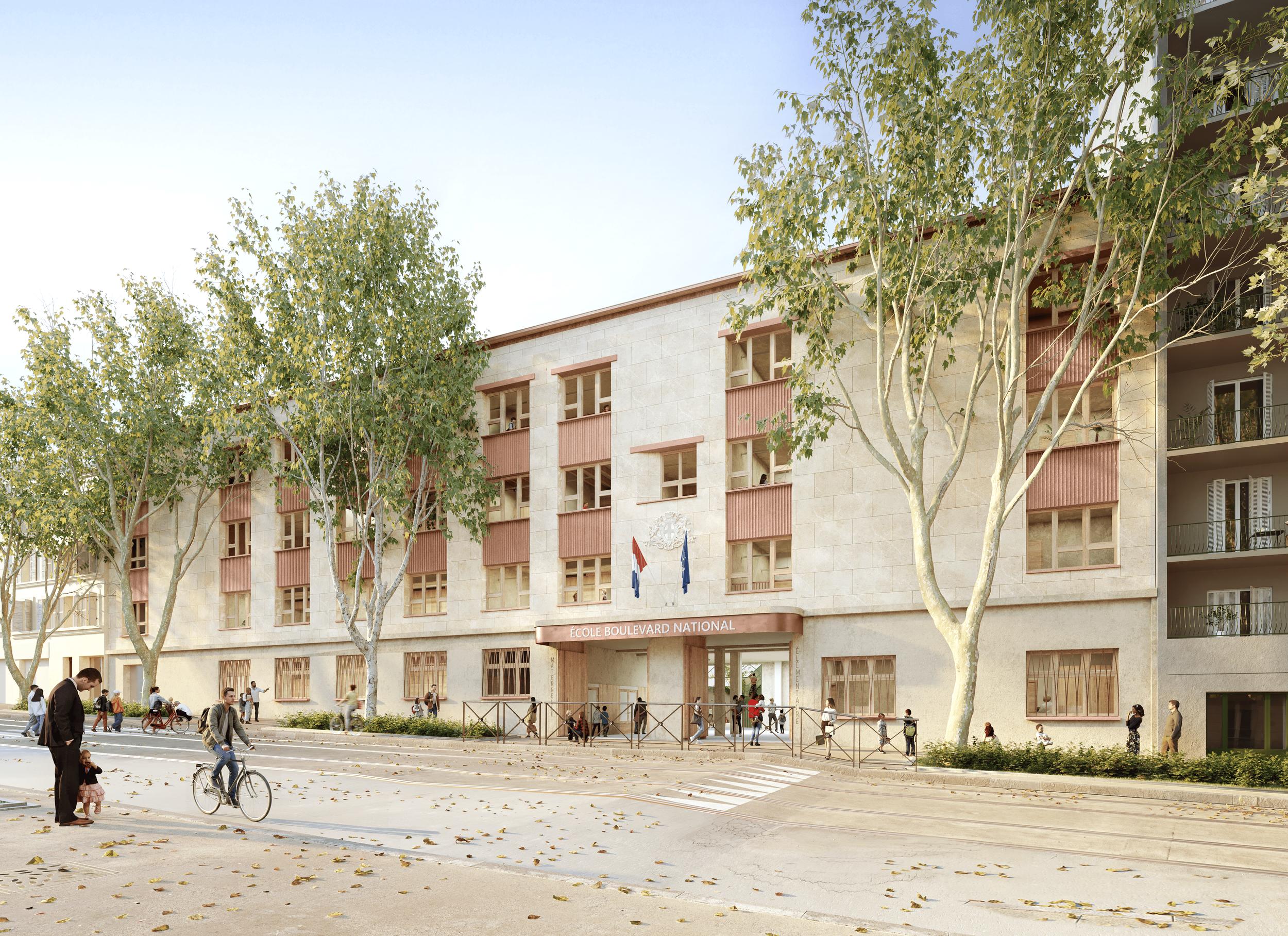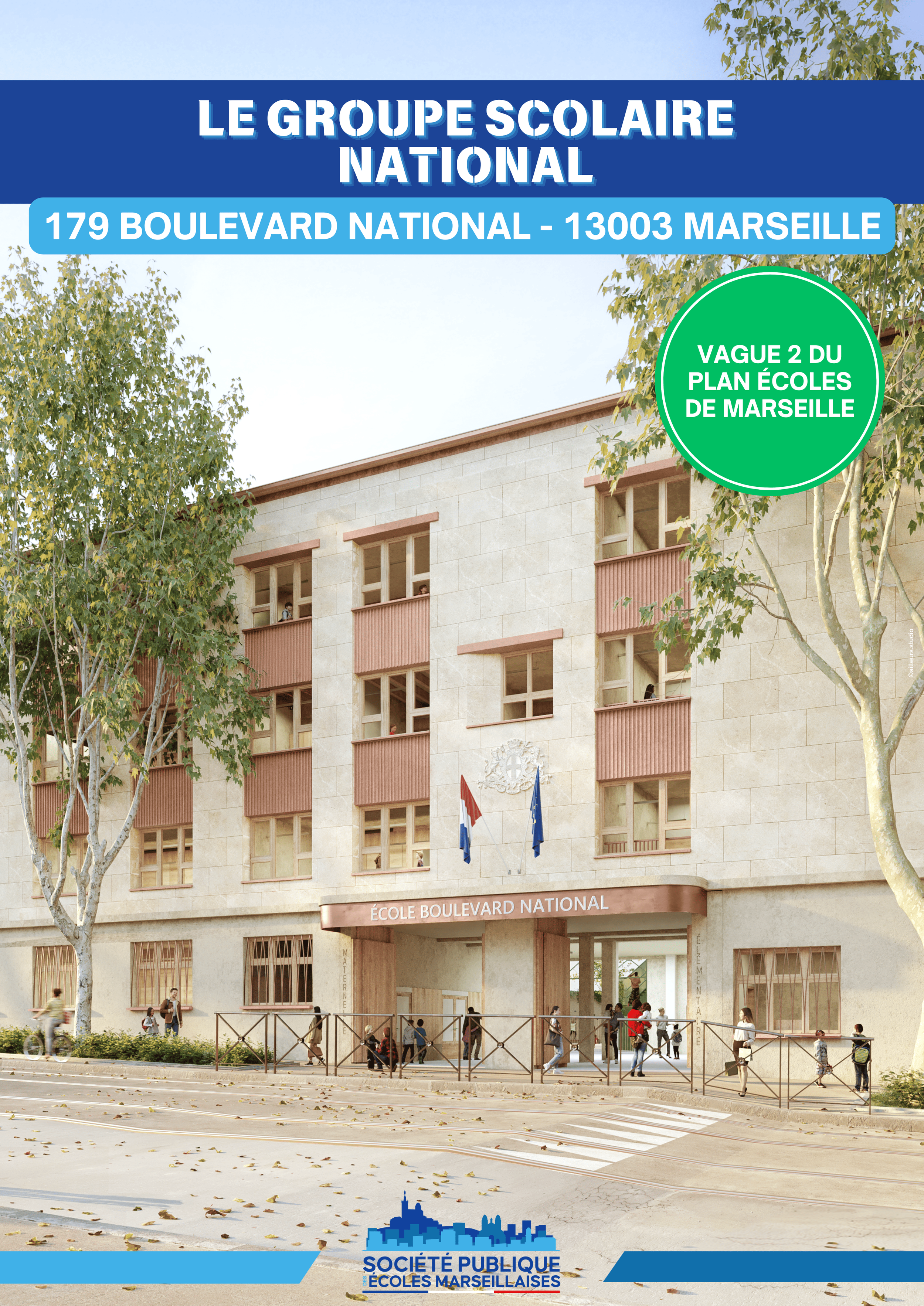 L’école National est située en plein cœur du quartier de la Belle de Mai. Elle s’intègre dans un environnement urbain dense et contraint, avec l’arrivée prochaine d’une ligne de tramway sur le boulevard National, qui viendra renforcer les connexions du quartier.